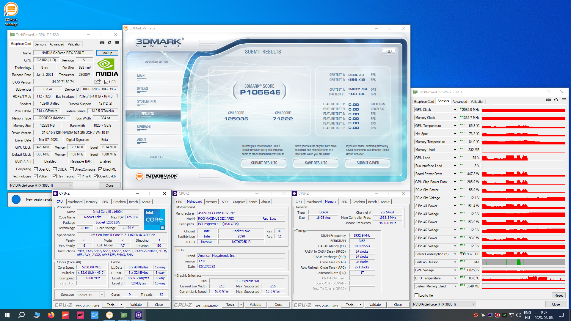 Brutál gpu score jött neki ki.Közben én sem tétlenkedtem, kipróbáltam a W11-et, gpu-ban sokkal rosszabb. A kisebbik, sima 3080 van a gépben, de most 5300MHz uncore-ral nyomattam. Ugyanúgy 6000MHz allcore a proci, azon nem emelek már, 89°C peak volt.