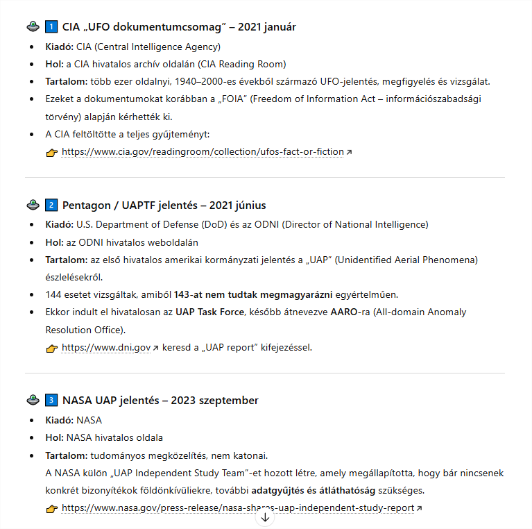 - és még sorolhatnámEzek már teljesen nyilvános akták, megfigyelések, sok ezer megfigyelés, katonai vagy műszeres természetesen, nem egy falusi ember elmondásai. A CIA és NASA, stb oldalakon meg lehet őket nézni, évek óta.