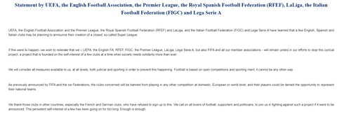 vagy itt van az uefa honlapján: [link] )remélem szénné fogják szopatni ezt a próbálkozást, kezdésnek eltiltanak minden ebben résztvevő csapatot a nemzeti bajnokságtól, és betartják a korábbi igéretet, miszerint eltiltanak minden játékost az EB/VB/egyéb tornáktól.