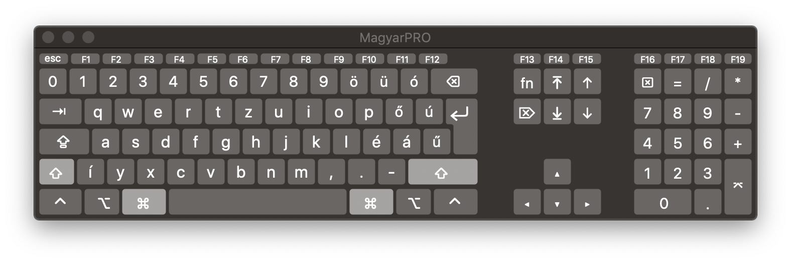 A Keyboard Viewer fizikai billentyűzethez társított kiválasztott billentyűzetkiosztást mutatja, nekem magyar bill. van, tehát Magyar kiosztáson ez van: