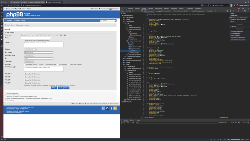 - külön desktopon egy Vivaldi a DeveloperTools-szal, a fejlesztett phpBB-kiegészítés teszteléséhez és frontend-debuggoláshoz, de ebben fut most épp a fórum is, amibe épp írok, meg egy másik fórum is