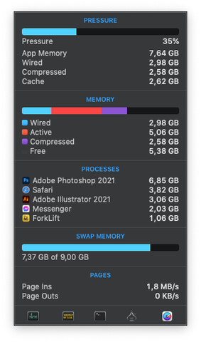 Safari (20-25 fül), Chrome (12-15 fül), Mail, Üzenetek, Skype, Viber, Messenger, Excel, Naptár, ForkLift, Pixelmator, Zene, ezek mind mennek folyamatosan. Alapvetően böngészés, levelezés, chat, bannerek és grafikák készítése, zenehallgatás. Munka közben.