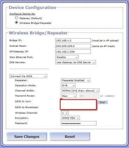 root password (kikövetelte), Wireless Bridge/Repeater, LAN IP cím, Mask, Gateway IP (az AP-nek más az IP címe), Operation Mode (visszavette, mert az AP csak G-s), Channel Width (meghagyta, bár az AP csak 20 MHz és aztán csak 20 MHz-et foglal le), SSID to Join, SSID to Broadcast, Passweord.