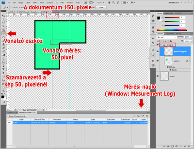 • Előveszed a vonalzó eszközt, a képedre zoomolsz, majd a Shift lenyomása mellett a kép szélétől elkezdesz egy vízszintes (vagy függőleges, amelyik neked kell) vonalat húzni, egészen 150 pixelig. A növekvő számot figyeled a fenti eszköztáron. Ha elért a 150-ig felengeded.