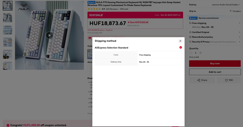 Feltéve, hogy az AliExpress standard shippinget választom, ami elvileg 1860 Ft.