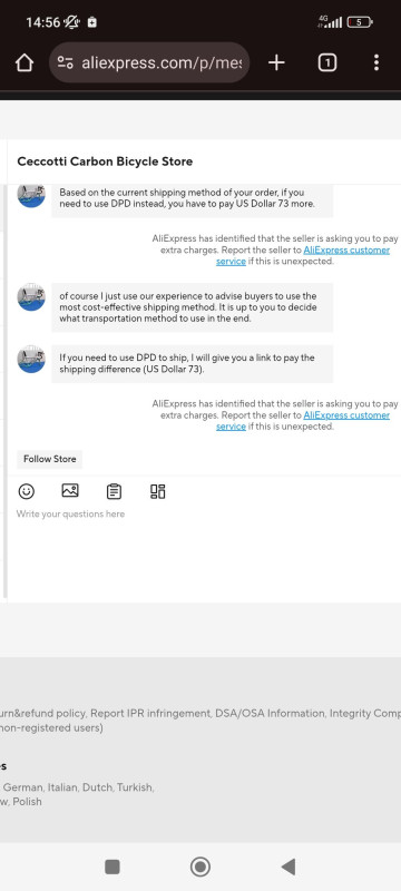 Felvettem a kapcsolatot az ali help centerrel de csak a sablon elhárító szöveget kaptam, írjak az eladónak stb...írtam az eladónak de ő nem válaszol semelyik feltett kérdésemre, se arra hogy jó-e a cím ,se arra hogy elfogadja-e a visszaszállítás várható költségét.