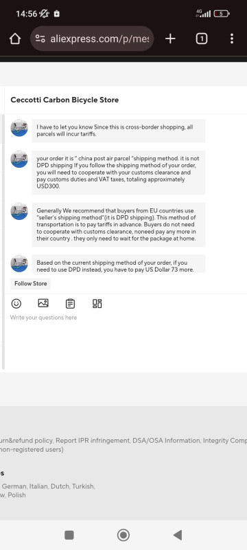 A rendelésem EU-n kívüli, és ha a china air post-ot hagyom, akkor a vámkezelés meg áfa az még 300 dollár lenne, cseréljem ki DPD-re, így azonban még kb. 73 usd-ral nő a postai költség.