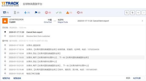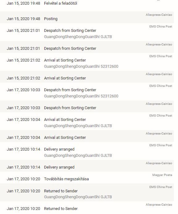 15-én 13:00:08 átadja szállításra, aztán meg sem járja a Nemzetközi Kicserélő Központokat, a kínai és magyar vámot és 17-én 10000 km-el arrébb 10:20:32-kor kézbesítik. Szimplán hülye a csávó.Én ennél többet nem tudok segíteni, minden információt megadtam amivel lehet továbblépni.