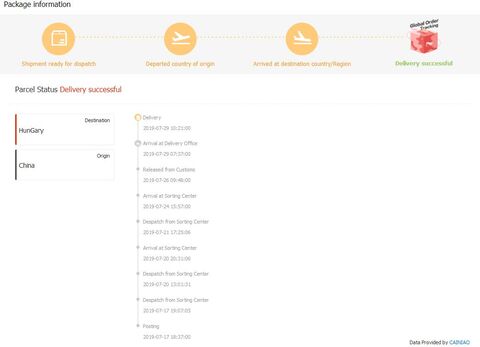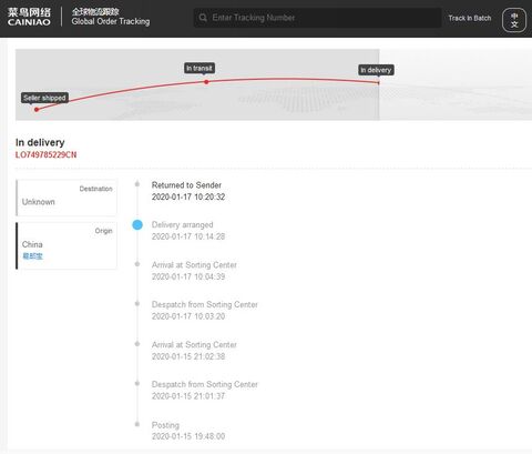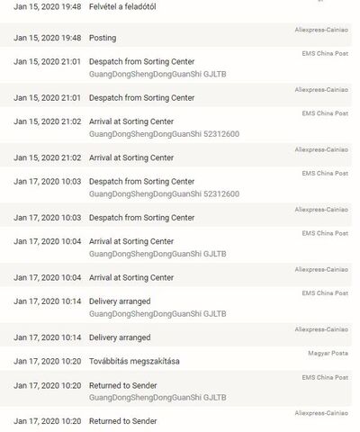 Én Cainao képpel kezdve összegyúrnám egy képbe és szövegesen leírnám hogy el sem hagyta az országot hiszen a nemzetközi bejegyzések hiányoznak, az viszont mindenhol olvasható hogy visszaküldték és a feladónak lett kézbesítve.