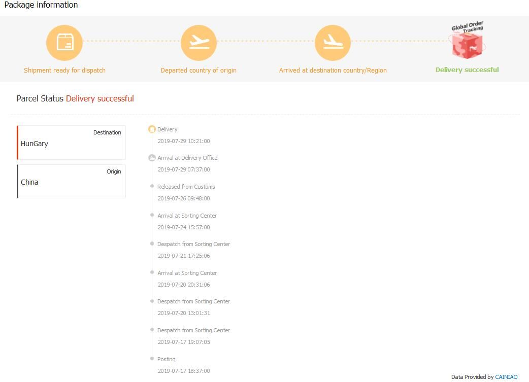 Meglepő módon az AliExpress hivatalos nyomkövetője a Cainiao is ezt írja:
