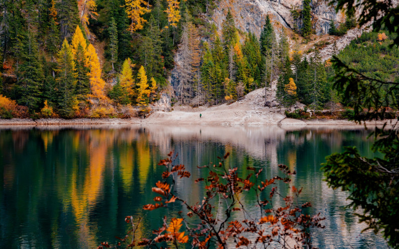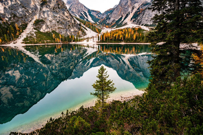 Az utolsó előtti elég tudatos lövés volt. (Ettől még az eredmény lehet semmilyen.) Bal oldalt a fenyők tükre, a tó unalmas részét a bokor takarja, jobbról a fenyő keretez. Ami érdekes, van egy X a képen az emberrel a közepén. Az X bal fele a tükröződő fenyő a jobb fele a kőomlás a fenyő alsó ágával.