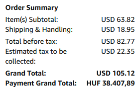 Forint folyamatosan gyengül gondolom ezért USD 81.05 és nem USD 82.77, de az "Estimated tax to be collected" az a bizonyos USD 22.35 ami a magyar 27% Áfa hiányzik a visszatérítésből.