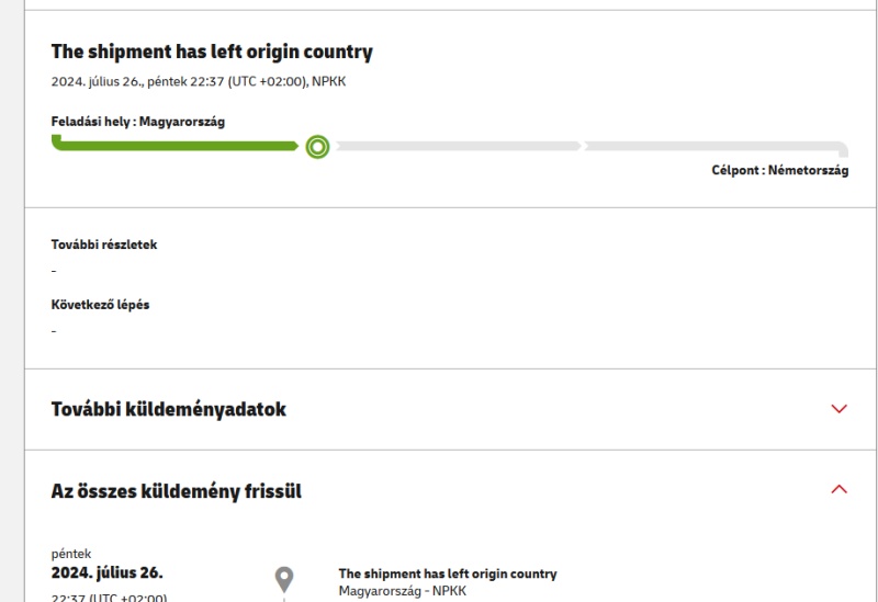 The shipment has left origin countryMagyarország - NPKK1 Tétel: JJD149990121160803699csütörtök2024. augusztus 1.14:36 (UTC +02:00)