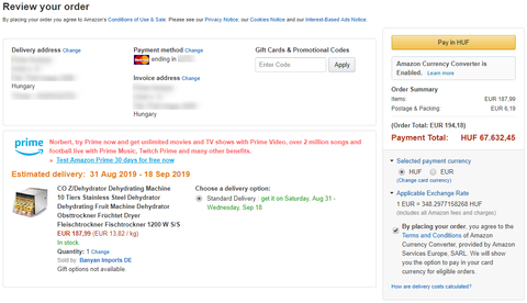 2. az "Amazon Currency Converter" opciot, mint olyan be kell kapcsolni vagy sem? Eleve ez csak egy segitseg, hogy mindjart lassam, nagysagrendileg mennyi lesz majd az osszeg forintban, de csak tajekoztato jellegu vagy befolyasolja a "pipa" a vegosszeget?