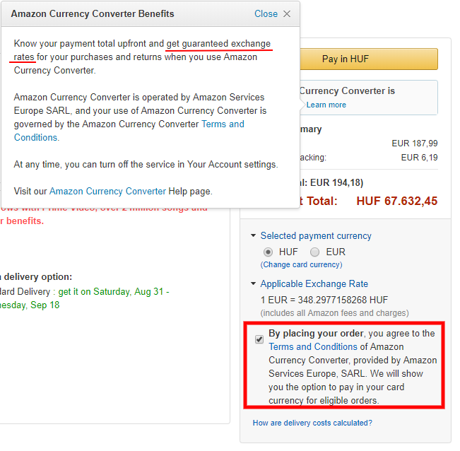 Mindig ki kell kapcsolni az amazon currencyt mert rosszabb mint ha a bankod valtja. -