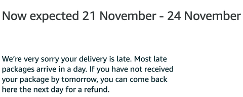Az elsőre megadott kb 1 hetes érkezési idő, megváltozott 2x is, állandóan hosszabbodott, most jelenleg azt írja, ha ma nem kapom meg akkor refundolhatok holnap.