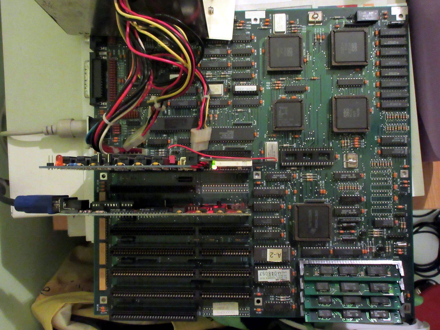 Van rajta floppy vezérlő is, meg úgy nézem jobb alján 8db 44C256 DIP IC-vel, Extended 1MB memoria is 85C212 EMS vezérlővel, de kell bele rendszermemória is a slotokba, hogy induljon.