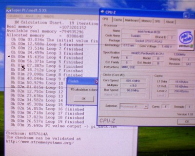 Lefutattam az 1,1 GHz-es Tualatin Celeron-unkon is a SuperPI-t, és 3 perc 39 mp lett az eredmény, 1,1 GHz-en!!! A Coppermine u.ennyi cache-el 600 MHz-en előbb végzett. Konklúzió: A Coppermine sokkal jobb lebegőpontos számításban, mint a Tualatin u. annyi cache esetén. Az FSB mindkét esetben 100 MHz volt.