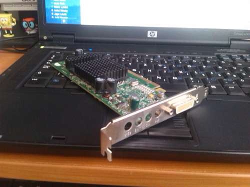 A helyzet az, hogy ez a VGA karesz gyárilag low-profie hátlappal rendelkezett egy lapos (Dell) házban. De most beraktam az itthoni szerverembe (kellett a normális kétmonitoros támogatás). Hirtelen viszont csak egy hangkártyát találtam, aminek a GAME portja épp ott van és épp akkora, mint a VGA kártya videókimenete