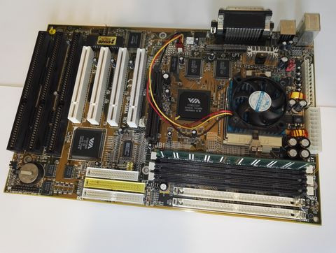 ) V586A. Cserébe egész jól felszerelt, Full ATX, SD+EDO, USB, PS/2, de csak szerény 512Kb cache-el. Mind1 is, viszonylag óccsóért, teszteletlenül, egy próbát megért. Kibontás után azért elbizonytalanodtam egy kicsit, mert kapásból 3db púpos kondit szúrtam ki messziről, de ezeket és 2-3 félrehajtott lábat leszámítva az előlapi ledeknél, szép állapotban van. Gyorsan elő is kerestem pár alkatrészt a teszthez, amit nem sajnálnék, egy ócska PCI-os S3 Trio-t, valami SD Ramot, meg egy MMX 233 procit. Jumperolás után félrehúzódtam a pukkanás elől és teszt...