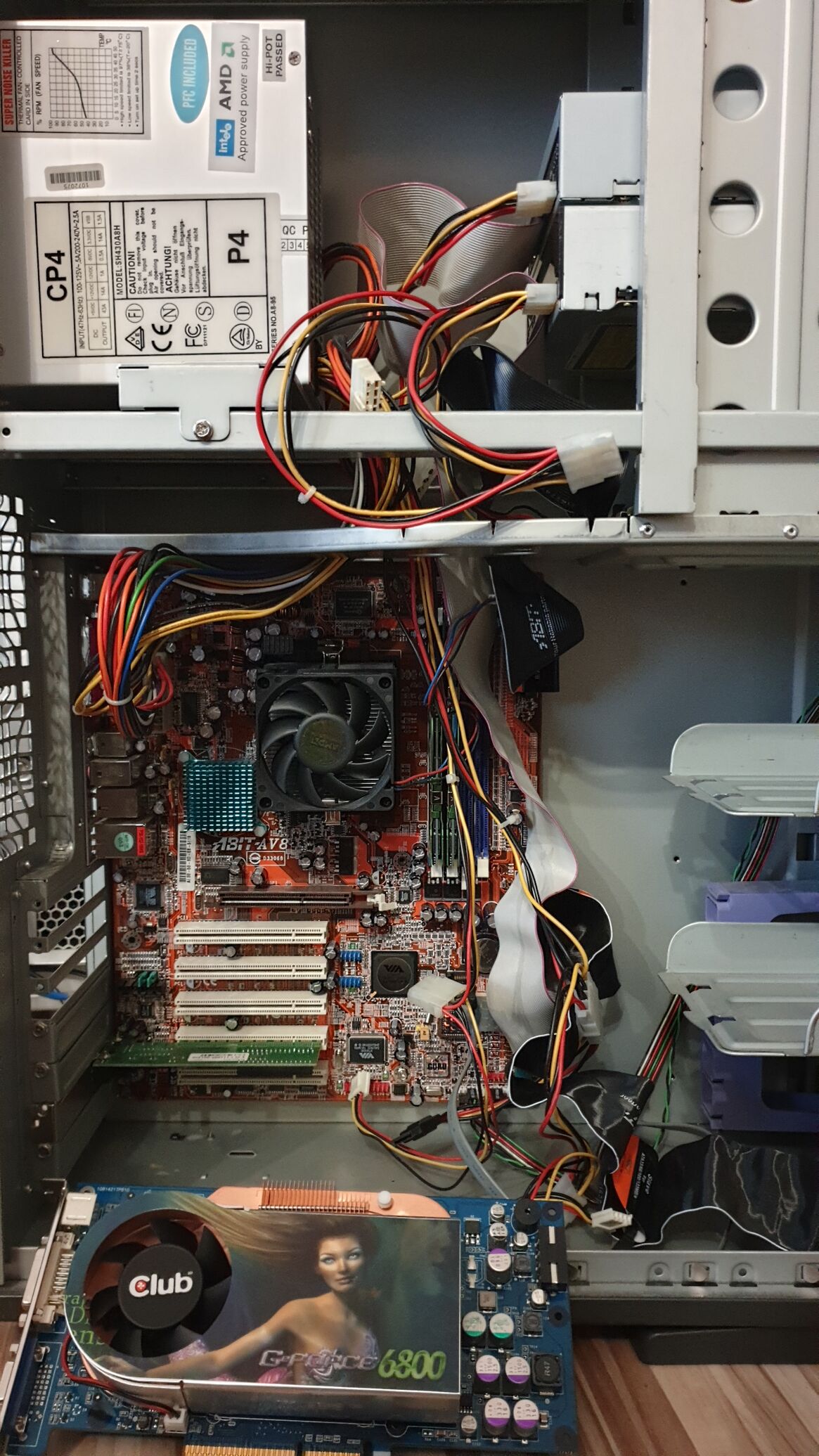 Én nem az esőben szedtem össze az udvarról hanem vettem ma lakásból ezt a szépséget, 2004-es cucc ABIT AV8 Athlon 3500+ 2×512 DDR-500 GeForce 6800, Chieftec Dragon ház. Táphibás volt, de az eredeti tápot is próbálom menteni.