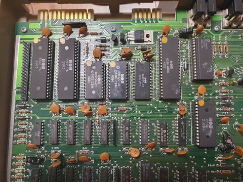 Kiszedtem mindent a CPU-tól balra és a SID-et (6581 a PLA alatt), mert mind foglalatban van és az induláshoz nem kellenek. Persze lehetne még sok minden, mert a MOS által gyártott TTL IC-k nem a legstabilabb cuccok. Szerencsémre itt már kaptam képet, tehát sorban jöhettek vissza az IC-k. Végül a kernal bizonyult hibásnak. Egy PLA döglött 85-ös lapból kiforrasztottam és beraktam a foglalatba. Így már megy minden amit ki tudtam próbálni. Hátra van még a floppy teszt, de remélem a legjobbakat.