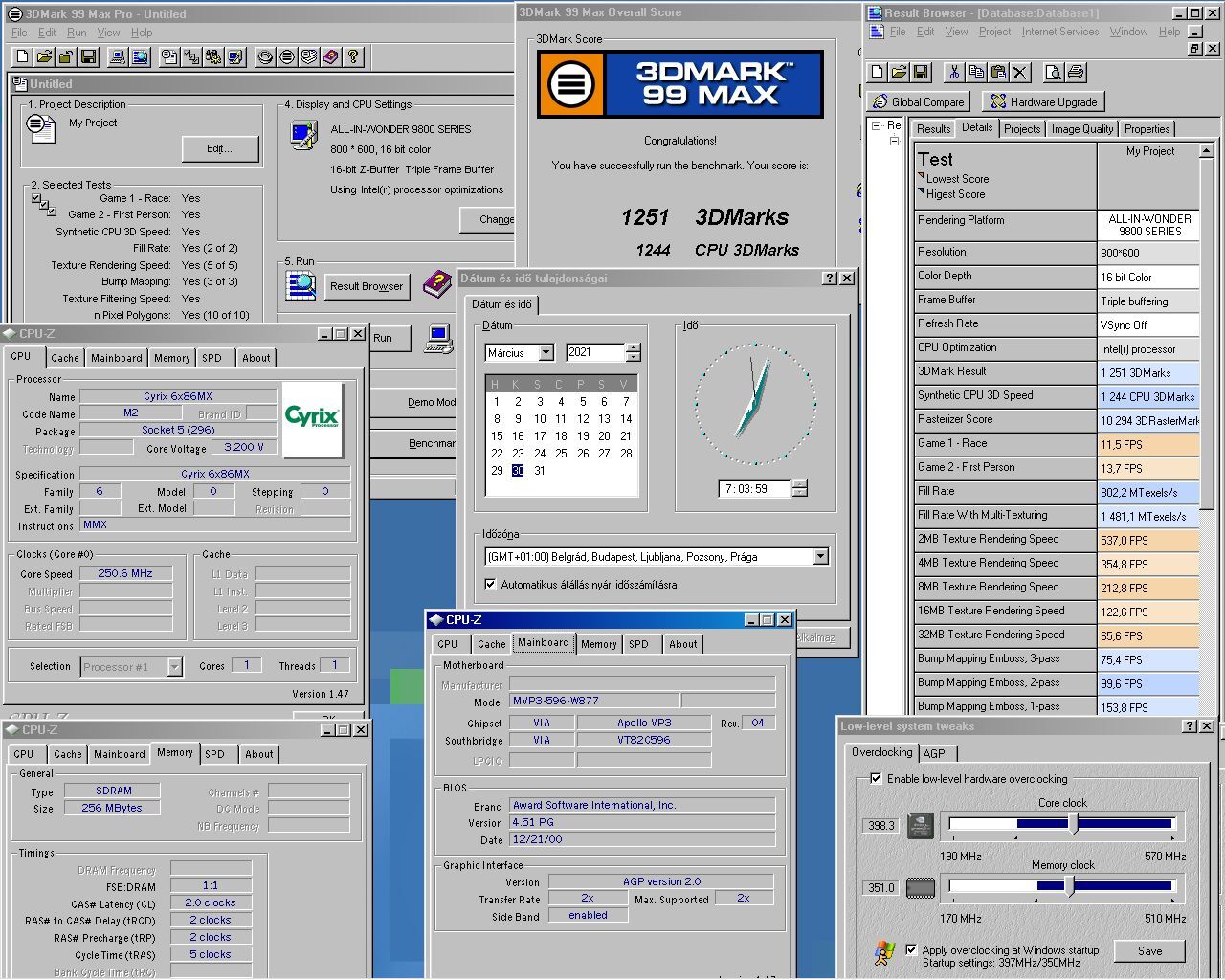 Az M-II 3DM99- ről pont nincs képmentés link a táblázatban, de az IBM Cyrix 6x86MX PR300 @2.5x100- ról van : 1251 pont. Csak kis eltérés van a 2 proci között. A képmentésen látszik hogy a game tesztek 10FPS felett mennek(a texture tesztek meg egész jók). Nehéz teszt már a 99 is egy átlag SS7- nek. Érdemes azonban megnézni a Quake teszteket a táblázatban, azok már elég jók, főleg a gyorsabb K6 procikkal. -