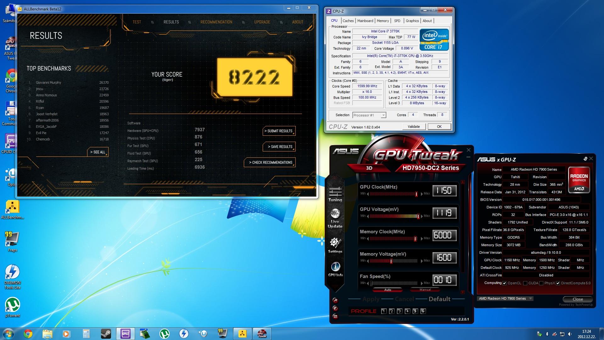 Dirt az oké,átlag 160t ment most, Metro is átlag 90-100 ,szóval ami csak a gpu-ra támaszkodik azzal nincs gond, pl F1 a vga-k 52-53%-n mennek és 2-3fps difivel annyit megy mint egy 7950