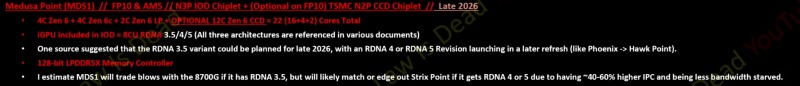 A CCD-k várhatóan 3nm-es, feltehetően a TSMC N3P node-ján készülnek majd.Ugyan a Desktop érdekel minket első sorban, de ami érdekesség, hogy a mobil fronton is a chiplet design felé fordulna az AMD, legalábbis a kiszivárgott "Medusa Point" képen egy CCD látható egy IO chiplet mellett, ami nagyobb, mint a desktop IOD (több GPU CU van rajta).