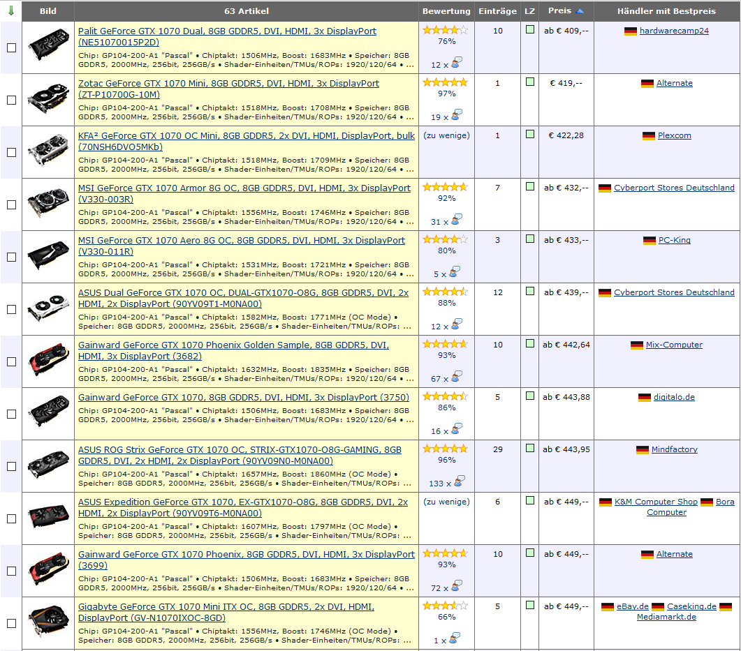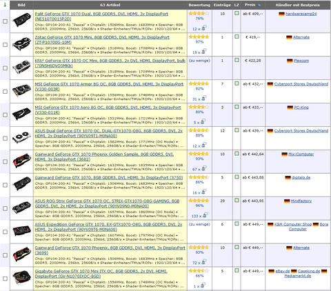 Itt a top 10 ket hete meg mind 400 alatt volt es a top 5 boven alatta egesz 360-370EUR-nal kezdodoen. A top 25 is meg mindig csak a 410-420EUR alatti savban mozgott. Es a 1080-al is hasonlo a helyzet, mind 499-nel kezdodik amig egy-ket hete meg volt eleg sok a 470-480-as savban is es rengeteg 500 alatt.
