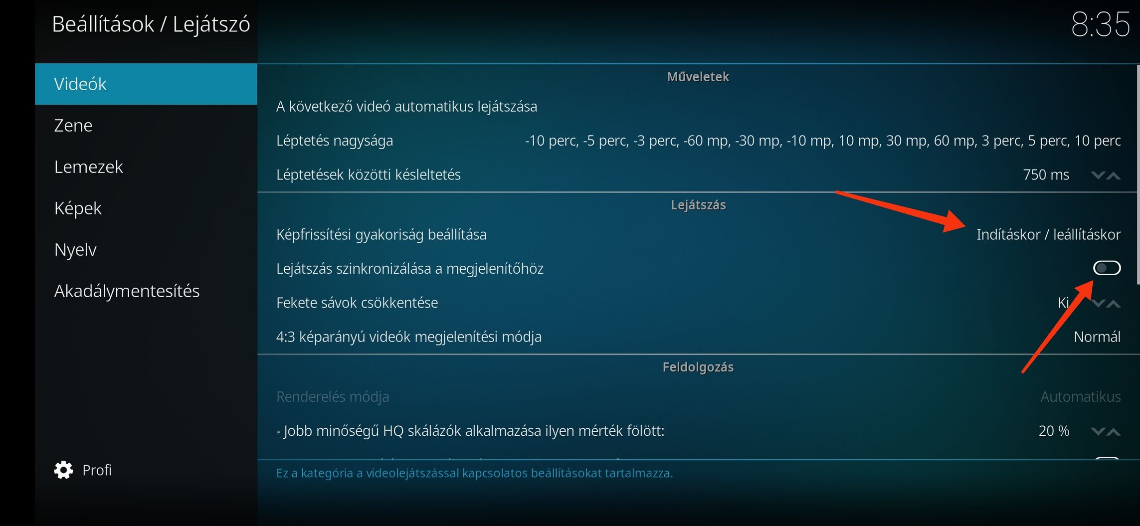 Szia! Gyanús, hogy a frekvencia váltás miatt van valamiért. Próbáld ki egyszer, hogy a kodi beállítások /lejátszó menüben a képfrissítés gyakoriság - ot kapcsold ki állásra. Ha így jó akkor a tv valamiért nem vált a megfelelő frekvenciára. Ha kell a kandenciahelyes lejátszás akkor lehet a tv-t kéne alapra állítani mert ott nincs rendben valami (már volt ilyen itt ha jól emlékszem) . Vagy előtte még próbáld meg másik hdmi bemeneten.