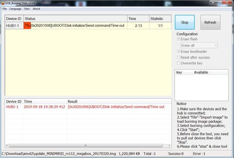 Connected success feliratnak kell megjelenni a burning tool-ban, ezután már nem szabad olyan hangot adni mint amikor lehúzol egy pendrive-ot, mert megszakad a kapcsolat, fix helyre kellene tenni a box-ot, és nem mozgatni a kábelt sem.