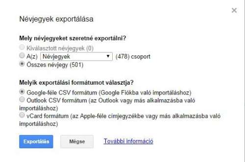 De ha használod a Google címtárat(egyébként is javasolt) akkor html felületen is könnyedén meg tudod ezt tenni különböző formátumokat választva: