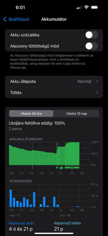 23-00-kor raktam töltőre, 3-ra feltöltötte pedig 6-kor veszem le a töltőről. Egyébként ugyanez van az órával is.