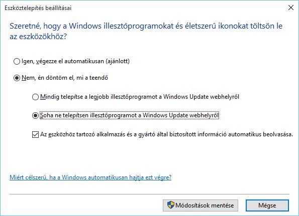 Ki kell kapcsolni az automatikus eszközillesztő telepítést.Start menübe bepötyög: eszköztelepítés beállításai