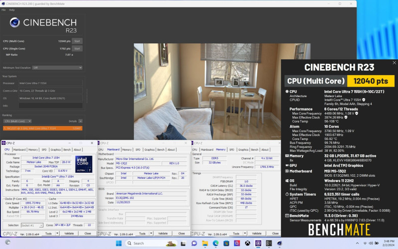 Intel Core Ultra 155h 16/22, 12040pts, 108C°