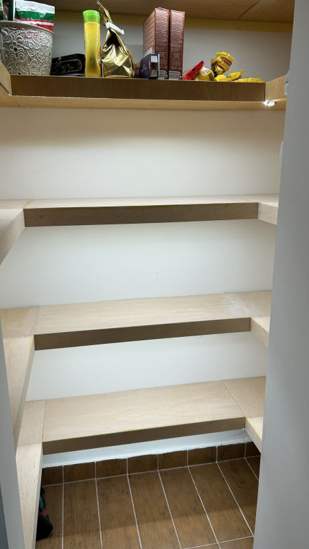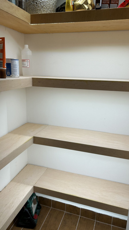 Szerkezetileg és villanyszerelés szempontból is kész a kamra. Már csak felületkezelni kell. Remmeres keményviasz olajjal kentem a felső két polcot, csak kifogyott a nafta. Sajnos így már ezzel kell a többit is. Nem a legjobb olaj. Sajnos besárgult tőle az anyag, olyan mintha már most 20 éves lenne. A tartósság majd kiderül az évek alatt.