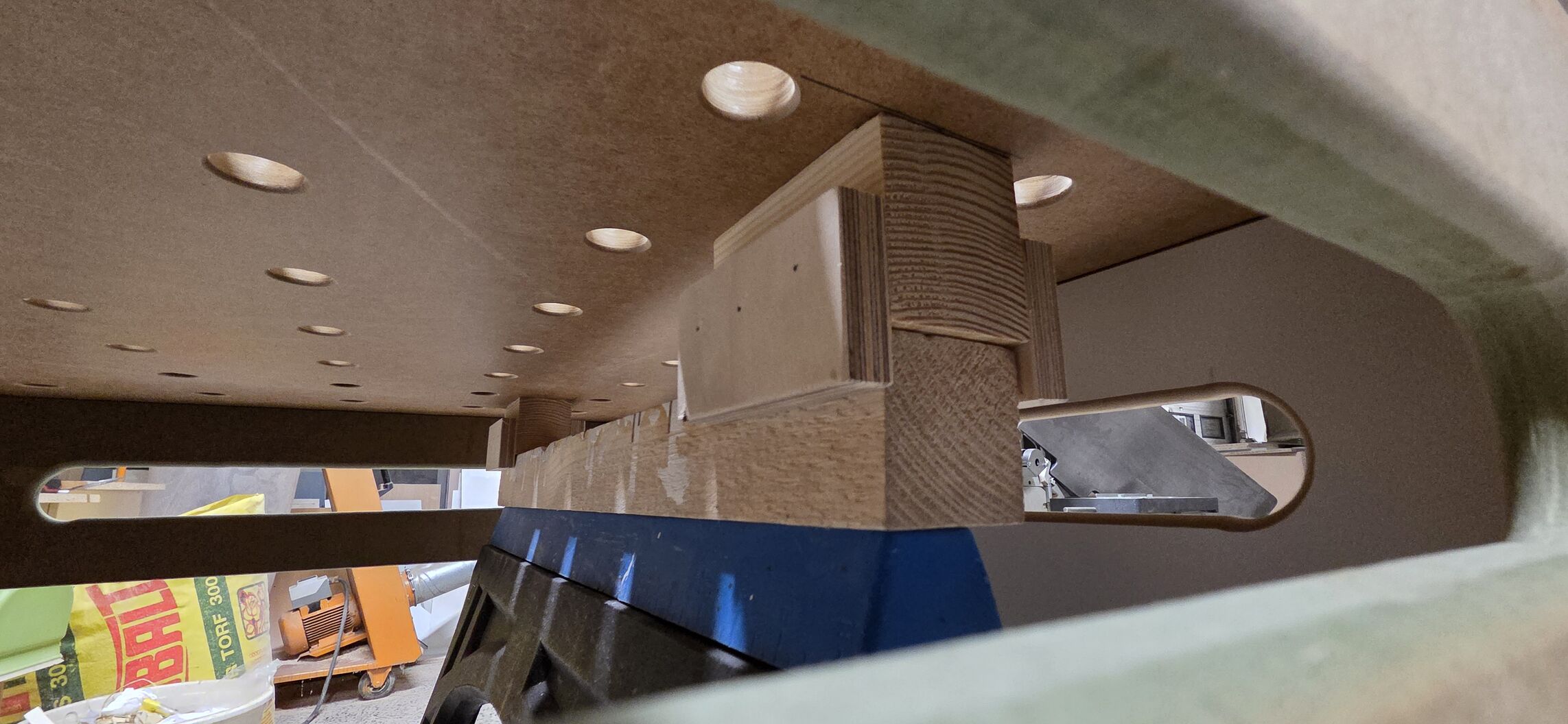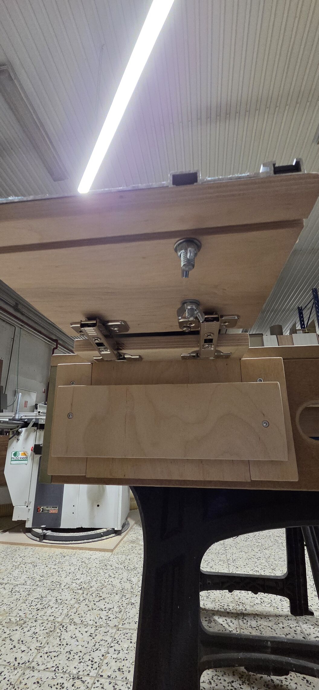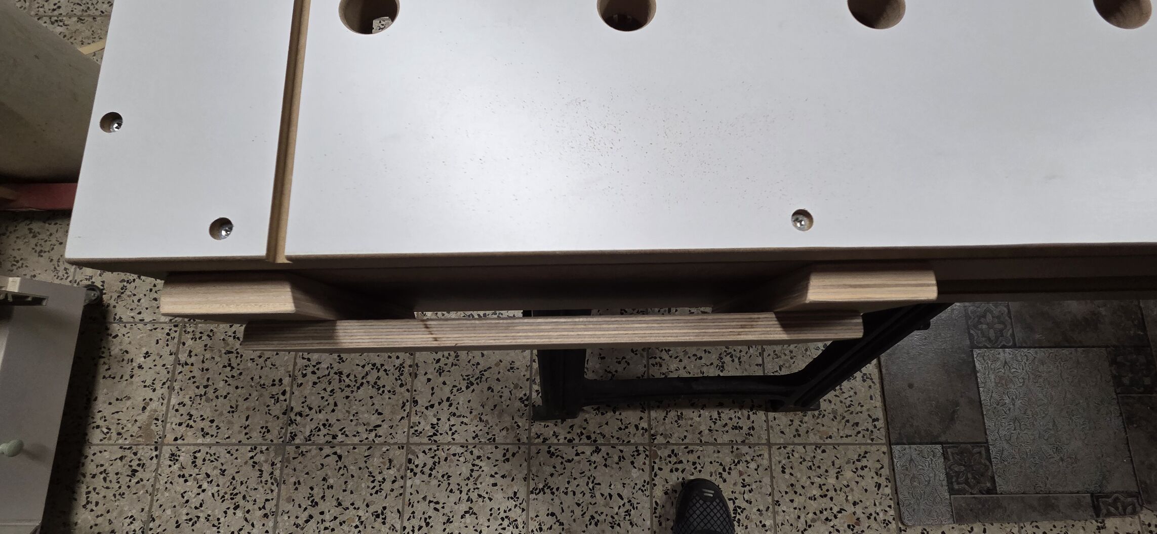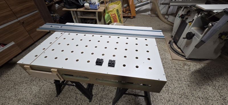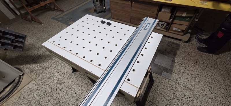 A héten összedobtunk egy MFT asztalt helyszíni szerelésekhez, azon belül is blendék és hasonló lapok beszabásához. 18mm-es MDF-ből készült, 96mm-es lyukkiosztásal, rövid és hosszú oldalra is rögzíthető, magasságban önbeálló vezetősín emelővel. Úgy csináltuk, hogy a meglévő műanyag bakokra kényelmesen és stabilan rá lehessen tenni, szerintem nagyon jól sikerült.