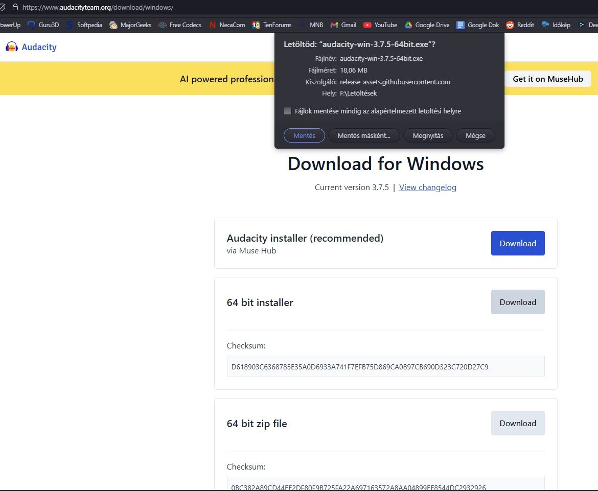 Ha mégis Audacity-vel operálnál, akkor ezt kell először feltelepítened (Audacity legyen bezárva) FFmpeg Installer for Audacity 3.2 and later (Lap alján az x86 vagy x64 verziót töltsd le és telepítsd fel)