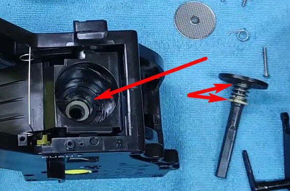 Öblítés vagy kávé lefőzése után víz marad a pogácsa (alsó szűrő) alatti üregben, aminek leeresztése a nyíllal jelölt résen történik. Ez tapasztalható akkor is, ha vizet öntünk a hengerbe, itt kell kifolynia: