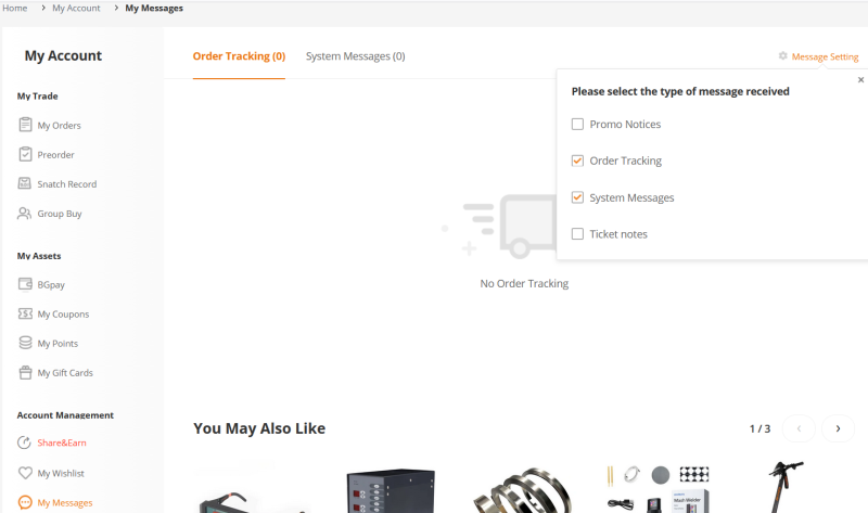 My Account, Account Management rész My Messages és a fogaskerék ikonos Message Setting