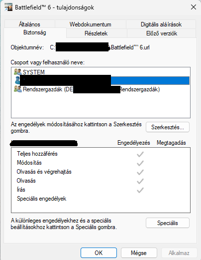 Vicces de csak annyi volt hogy rendszergazdaként kellett inditani az exe file-t, és most jó, ez ideág oké csak ami fura nekem hogy van ott más is ami szerintem idegen. Meg nézné valaki aki rá ér, hogy Bf 6 exe file jobb gomb-tulajdonások-biztonság, csoport vagy felhasználo neve alatt mit lát?