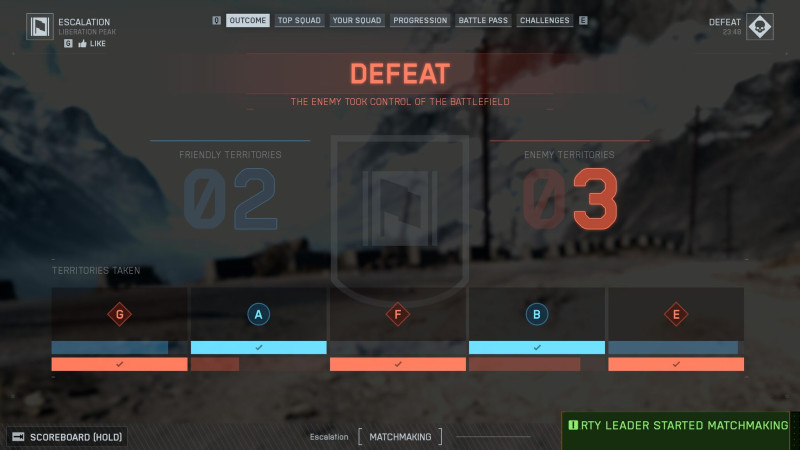 (Tegnap volt egy hasonló kör Liberation Peak-en, már 300-900 körül volt a ticket, rá voltunk préselve a bázisra, amúgy is nagyon nehéz erről a mapról onnantól kezdve kitörni, ha nincs zászlónk. Meguntam, fogtam magam és repülővel pálya másik felén ugrás, pontfoglalás. Egy szutykos squadtársam sem spawnolt rám, mindegyik tápolt az alapon...)
