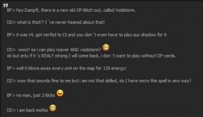 Amúgy a t1-harcot ezzel a módszerrel kb. el is felejtheted, vagy pedig direkte csak erre koncentrálnál, ami azért rizikós, mert ha kivédik a támadásod, akkor tuti bukta...Egyébként a nature hatalmas előnyben lenne a heal miatt, ahogy a shadow is a buffok miatt. Pl. ha valakinek sikerülne lehoznia egy harvit, akkor azt az életbe nem szednék ki semmivel, mivel a unitszám erősen korlátozva van ezáltal. Jah és akkor még nem is beszéltem a frost ice shield-jéről és hatalmas életű egységeiről, hiszen az meg alapból arra van kiélezve. Pl. hogyan szednél le olyan módszerrel egy 3 war eagle-ből álló splash-t egy rájuk dobott area ice shield-el? Óh, tényleg, majdnem elfelejtettem a lost reavert! Úgyszintén, az életbe nem szednéd ki ha megtámad, hiszen alapból tanknak van előállítva, egy kis buff és kész is a halhatatlan egység. És ez utóbbiról nem is szólva, hogy csak UC kártya, szóval gondolom az "értéke" nem verné a plafont...