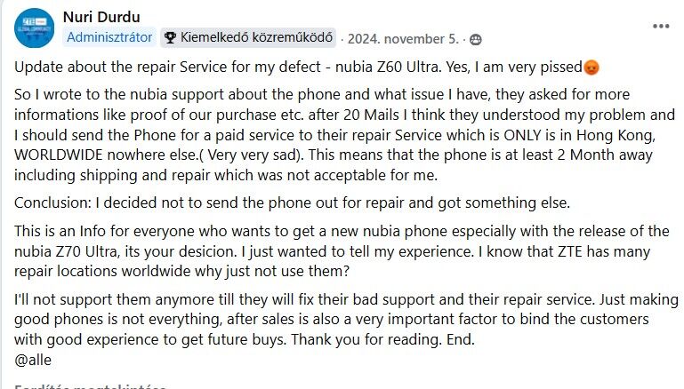Z60 ultrám van, és tagja vagyok a nubia csoportnak a facebookon. Az ottani adminnak volt vmi gondja a telójával, és azt írta, csak Hong-Kongban javítják.