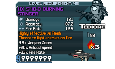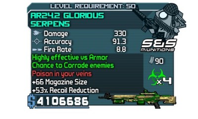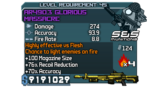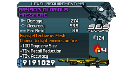 Rengeteg minden számít egy fegyver árában...most sem értem igazán,csak gondolom,hogy rengeteget számítanak a kiegészítő jellemzők az árban.Milyen gyorsan tölt,mekkora a tár,milyen gyorsan tart célra miután futsz vagy ugrassz,mennyire tudod pontosan a célon tartani minden nehézség nélkül,illetve a narancs színű felirat,hogy nagy eséllyel lobbant lángra (ez esetben nem kell feltétlenül narancs színűnek lennie a fegyvernek,csak a felirat a jellemzőkben.nekem van pl 1xes tüzes revolverem ami nem narancs,narancs felirattal és kivétel nélkül lángra lobbantja a célpontot).A pearl fegyverek amúgy nem olyan drágák,ahogy észrevettem.Ez az áresés meg nekem is ismerős,de azt hittem,hogy csak elajándékoztam a fegyvereket,miután felvettem egy max áras fegyvert és másnap nem találtam...lehet nem is.Az általam talált fegyverek meg azért is lehetnek jobbak,mert mondjuk 4en 64es crawból szedtem,úgy értem,magas nehézségi fokozaton volt a játék (pt 2.5 ) ilyenkor gondolom a kalkulátor magasabb szintű fegyvereket kreál.Ám ilyen drága 45ös fegyvereket talán még soha nem találtam,ha nem szólsz észre sem veszem