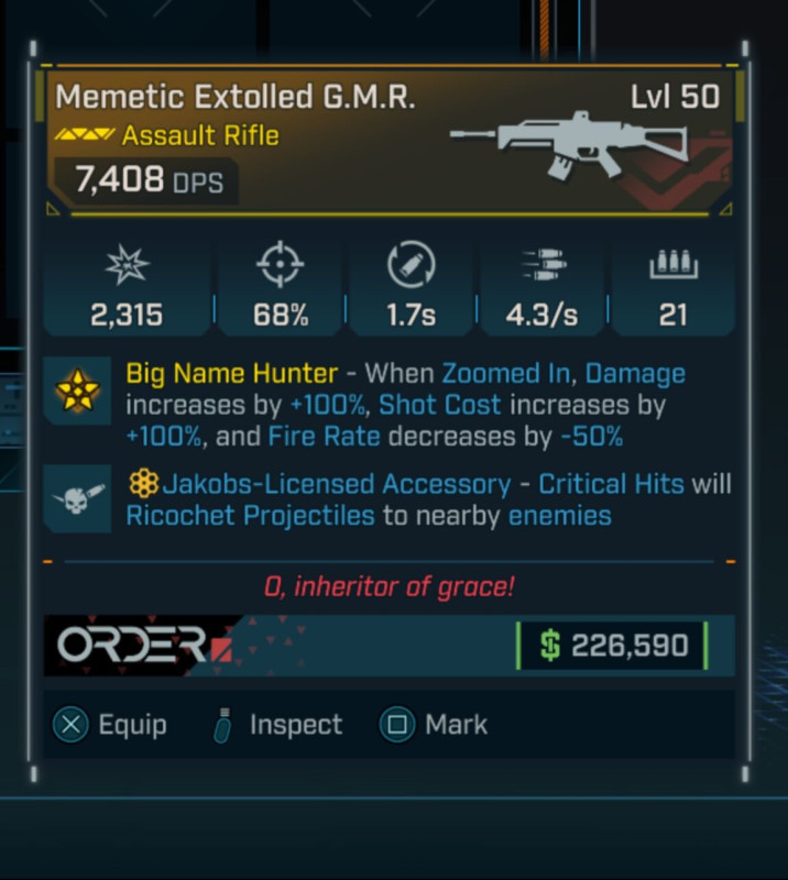 Nemrég mission rewards-ból kaptam egy G.M.R.-t, nem gondoltam volna, hogy ez egy jó fegyver. 😯 Az egyetlen olyan Order-es fegyver amit nem kell feltölteni lövés előtt. 😄👍