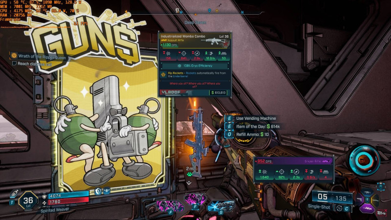 Oké, ma már 6 alkalommal jött legendary: vending machine-ből egy class mod (Vampiric Avatar), egy pajzs (Hoarder), a Wombo Combo, egy Forsaken Chaos és egy Rainbow Vomit shotgun. Valamint egy mellékküldetés során valahogy esett egy Gorging Hellfore sub.