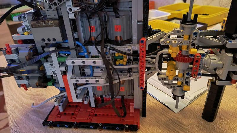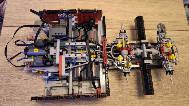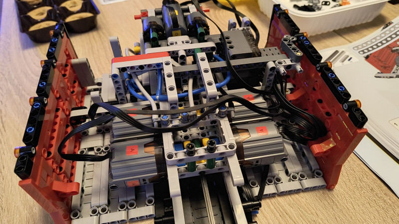 Pár lépéssel később következik a négy darab XL motor beépítése, utána egy 32-es, karbonból készült rudat kell átfűznünk közöttük, végül két sárga váltó-fogaskerékkel összekötni őket. Ezen a rúdon keresztül fogják a motorok átvinni a hajtást a hátsó tengelyekhez. Ha ez megvan, következik két pneumatikus kapcsoló bekötése, majd a három szervómotor csatlakoztatása, végül, ha ez kész, jöhet az újabb teszt.