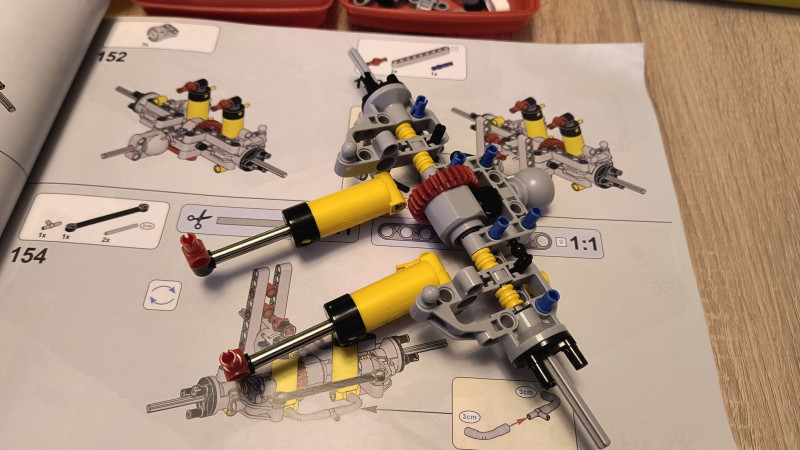 Kicsit korán keltem, mert tegnap nem sokat tudtam haladni az építéssel, és ma szeretném legalább az első fázist teljesen befejezni. Nagyon bonyolult ez a készlet. Az első építési szakasz eléggé sokáig tart, mivel szinte a komplett pneumatikus rendszert és a motorokat már most bele kellett építeni, plusz fel kellett tölteni az akkumulátort és a távirányítót is, hogy le tudjam tesztelni a motorok megfelelő működését.